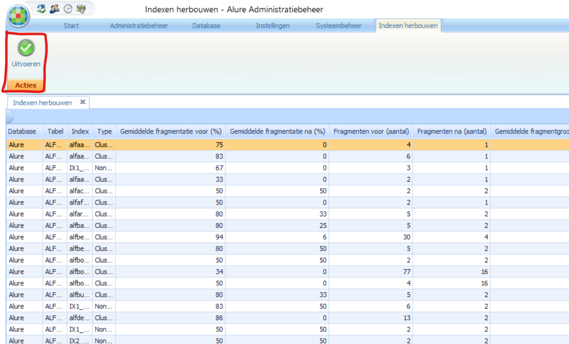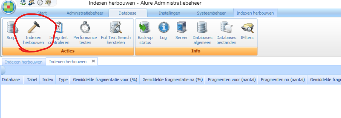 Indexen herbouwen kan helpen de performance van de applicatie te verbeteren. Herbouwen van de indexen van de Alure database kan helpen indien je merkt dat de applicatie trager wordt. Het opnieuw herbouwen van de indexen heeft tot doel de selecties en de selectieve bewerkingen op de database te versnellen. Het reduceert het aantal vergelijkingen dat nodig is om één of meerdere databaserecords te vinden.