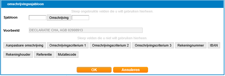 Dit gedeelte toont de omschrijving die ook in de Bankafschriften-wizard wordt getoond. Deze is standaard gevuld met de omschrijving van het bankafschrift (het eerste grijze veld in het Regelinformatiegedeelte). De inhoud van het veld Sjabloon kan worden aangepast of verwijderd. Daarnaast kan het veld Sjabloon worden gevuld met vaste en variabele gegevens. Standaard is er een wit tekstveld zichtbaar dat kan worden gevuld met variabele gegevens.