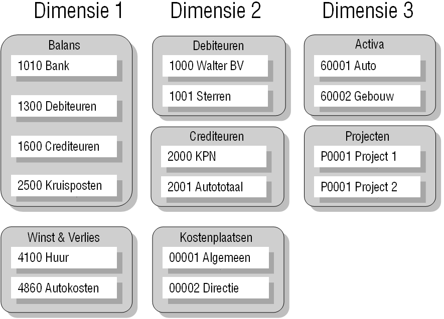 De bovengenoemde niveaus hebben een verband met elkaar. Dat betekent dat een volgend dimensieniveau enkel toepasbaar is als de boekingsregel reeds verbonden is aan een hoger liggend niveau. Met andere woorden: een boekingsregel dient gekoppeld te zijn aan een kostenplaats (niveau 2) om een project of activa (niveau 3) aan de regel toe te kennen.