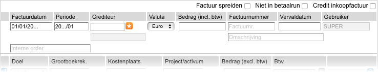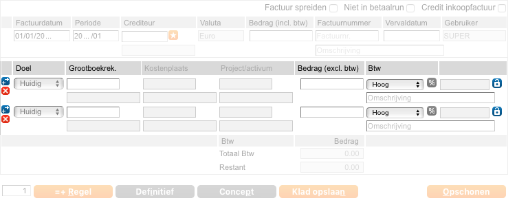 - Initieel aantal regels: eze waarde bepaalt het aantal lege (detail)regels dat standaard beschikbaar is voor een boeking binnen het betreffende dagboek. De onderstaande afbeelding toont het scherm 'Invoer - Inkoopfactuur' waarbij het initieel aantal regels voor het dagboek is ingesteld op '2'.