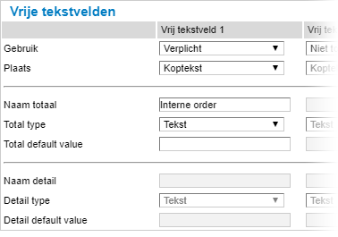 - Totaal- en detailregel: zet de vrije tekst in zowel de kop als de detailregel. In beide velden, 'Naam totaal' en 'Naam detail', kan het label van het vrije veld worden vastgelegd.