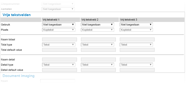 - Chequenummer: niet gebruikelijk in Nederland, daarom dit veld op 'Niet toegestaan' zetten. Dit kan aangepast worden wanneer dit toch gebruikt wordt.
