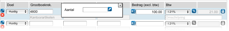 - Aantallen: stel dit in wanneer gebruik gemaakt wordt van aantallen. Dit veld kent de opties 'Verplicht', 'Toegestaan' of 'Niet toegestaan'. Zowel bij 'Verplicht' als 'Toegestaan' verschijnt het aantallensymbool per boekingsregel op het invoerscherm. Klik vervolgens op het symbool om aantallen per regel vast te leggen.