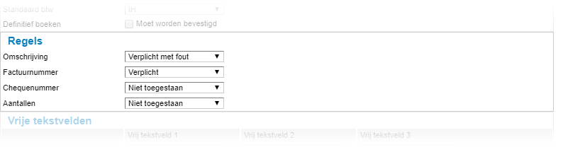 - Omschrijving: leg hier vast in welke mate een omschrijving bij de invoer van een boeking verplicht is. Keuze uit de volgende drie opties: