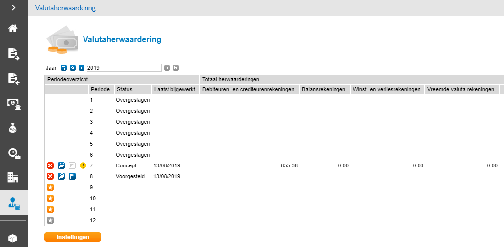 - Definitief: valutaherwaardering is geboekt als definitief. Deze valutaherwaardering en de status van voorliggende perioden kunnen niet meer worden gewijzigd.
