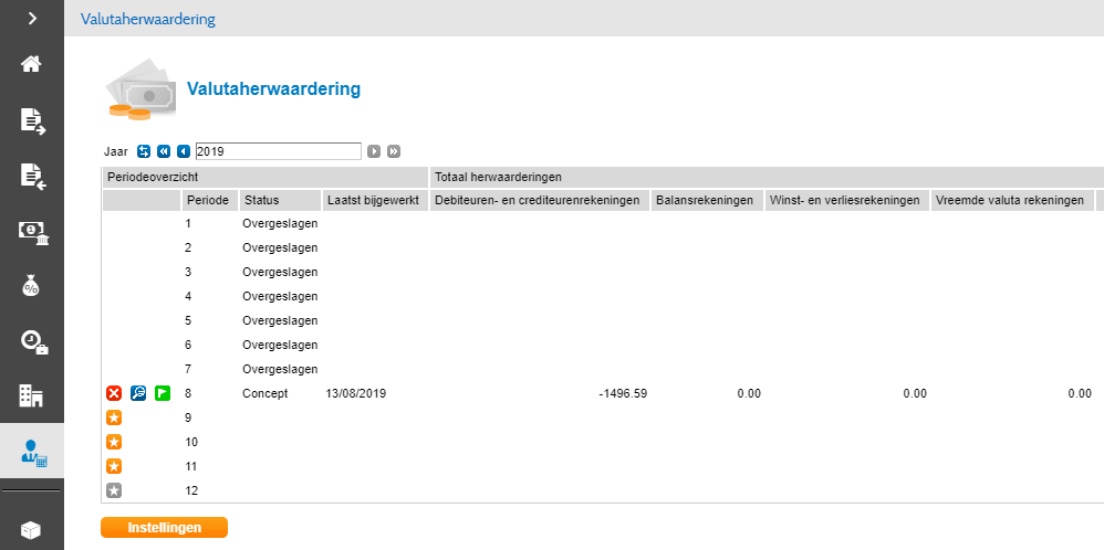 In onderstaand voorbeeld zijn de perioden 2019/01 tot en met 2019/07 overgeslagen, de valutaherwaardering is concept geboekt: