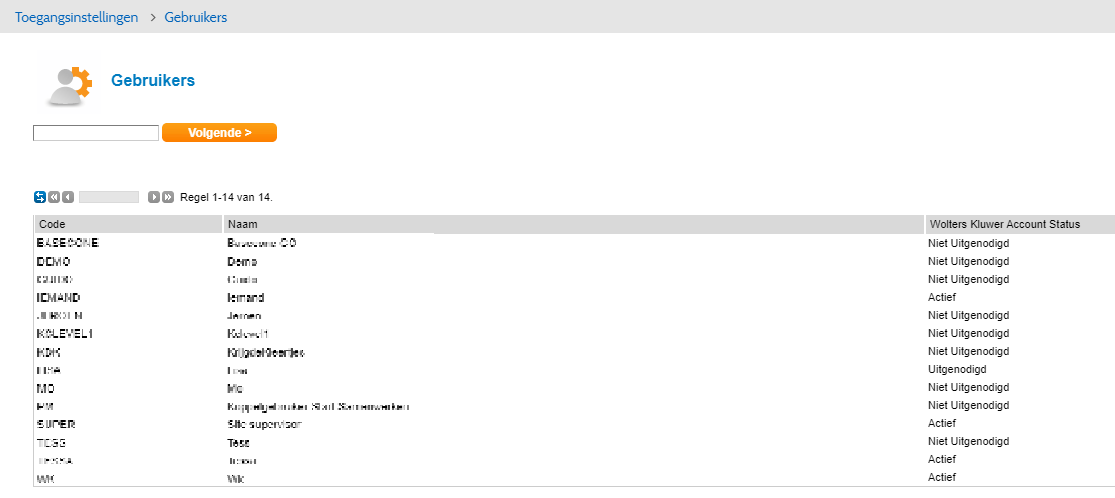 Ga voor dit overzicht naar Instellingen > Toegangsinstellingen > Gebruikers. De status van de gebruiker met een Wolters Kluwer Account is 'Actief'.