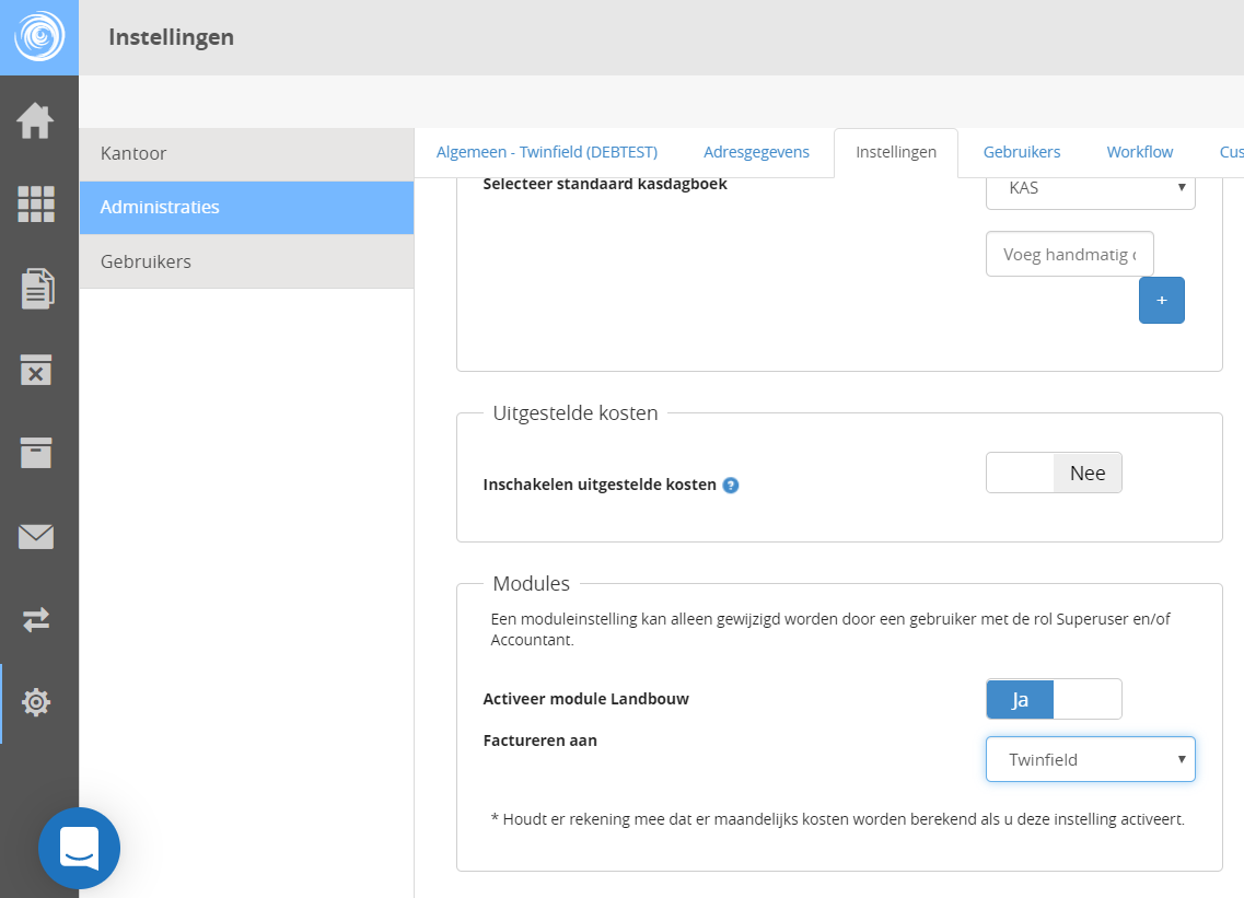 Ga in Basecone naar Instellingen > Administraties en kies onder 'Acties' voor het wijzigen. Onder de tab Instellingen staat onderaan nu een blok Modules. Activeer nu de module Landbouw.