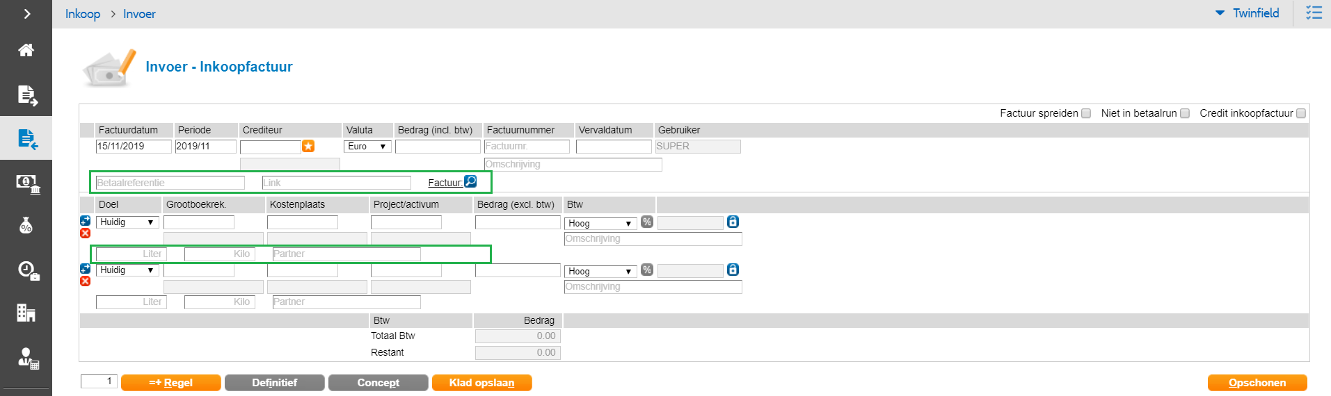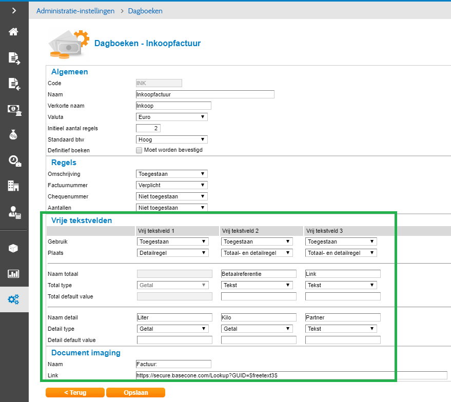Bij het verwerken in Basecone zijn nu extra velden zichtbaar die kunnen worden ingevuld. Denk aan een EDI code, aantal en hoeveelheden. Deze velden worden aan de grootboekrekening gekoppeld die wordt gebruikt bij het doorboeken.