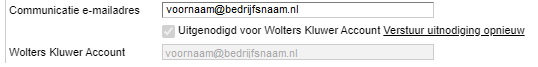 Zet daarna het vinkje Uitnodigen voor Wolters Kluwer Account aan om een uitnodiging per e-mail te versturen. Zodra je op de knop Opslaan klikt, wordt de uitnodiging meteen verstuurd. Je krijgt geen bevestiging te zien dat de uitnodiging is verstuurd.