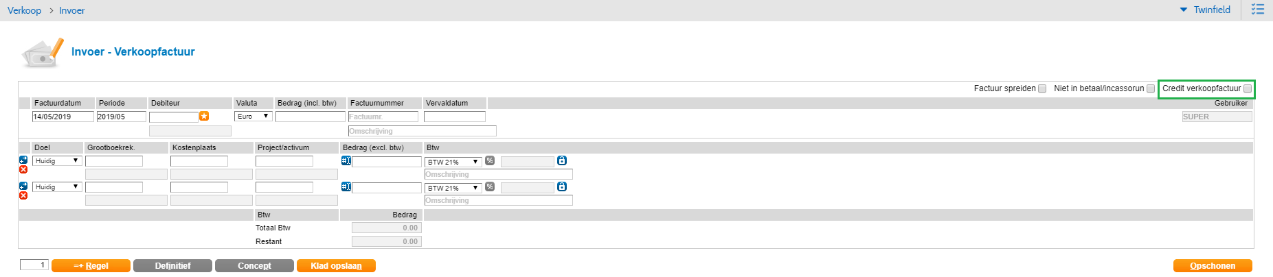 Indien het vinkje "credit verkoopfactuur" aan gezet wordt én het bedrag negatief ingevoerd wordt, zal Twinfield dit lezen als een normale factuur (- en - wordt +).