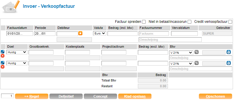 Lees in dit artikel alles over het invoerscherm voor een verkoopboeking. Dit is de basis van verkoopboekingen en de opties in Twinfield Boekhouden. In het invoerscherm kan een verkoopfactuur handmatig worden ingevoerd.
