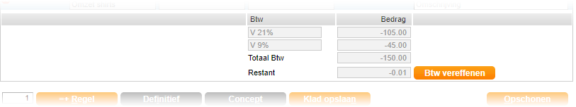 Het veld 'Restant' geeft het verschil aan tussen het opgegeven bedrag in de sectie 'Kopregel' (totaalbedrag van de nota) en de som van de ingevoerde bedragen op de transactieregels (sectie 'Transactiegegevens'). Het restant dient op '0' te staan alvorens de boeking als [Concept] of [Definitief] te verwerken. Let op: Als gevolg van afrondingsverschillen bij de berekening van de btw kan een situatie ontstaan dat er een restant is van enkele centen. Is dit verschil 2 eurocent of lager, dan kan de toepassing het restant vereffenen door gebruik te maken van de button [Btw vereffenen].