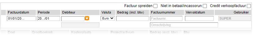 • Periode: Op basis van de (ingevoerde) factuurdatum bepaalt de toepassing de boekingsperiode. Deze periode is eventueel aanpasbaar door zelf de gewenste boekingsperiode te selecteren. Formaat: jjjj/mm.