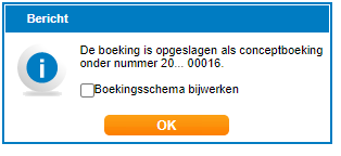 Klik op [OK] om het venster te sluiten. Let op: het genoemde venster biedt een optie 'Boekingsschema bijwerken'. Voor meer informatie zie artikel Waarvoor is de optie boekingsschema bijwerken?
