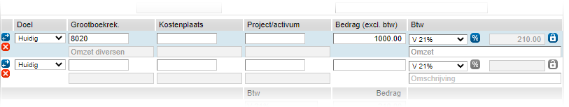• [+ Regel]: Gebruik deze button om de ingevoerde transactieregels vast te leggen en een nieuwe transactieregel toe te voegen. De toepassing legt de boeking bij deze actie automatisch vast (Klad opslaan).