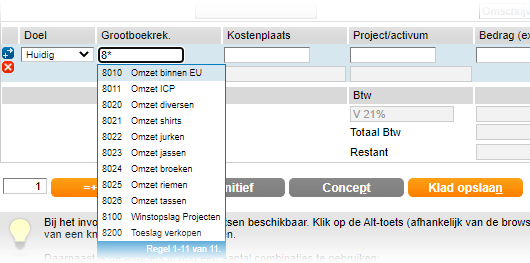 • [Klad opslaan]: Sla de ingevoerde gegevens van de boeking tussentijds op door gebruik te maken van deze button. Deze actie maakt geen journaalpost aan en is dan ook geen verwerking in de boekhouding. Is de boeking als klad opgeslagen, dan is het mogelijk om de ingevoerde gegevens weer snel naar voren te halen als het invoerscherm (per abuis) vroegtijdig wordt verlaten.