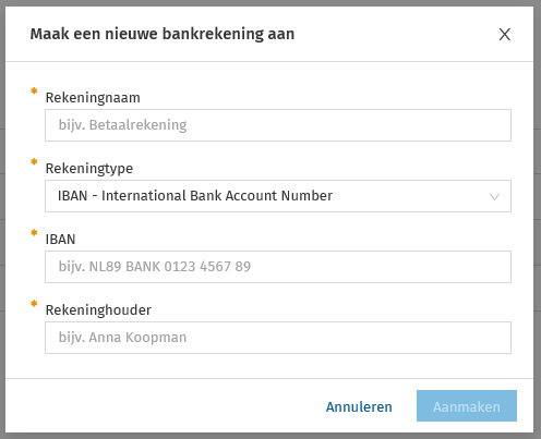 Deze pagina bevat de ingevoerde velden van bankrekening toevoegen. Alle velden zijn aanpasbaar zolang er geen actieve bankkoppeling is.