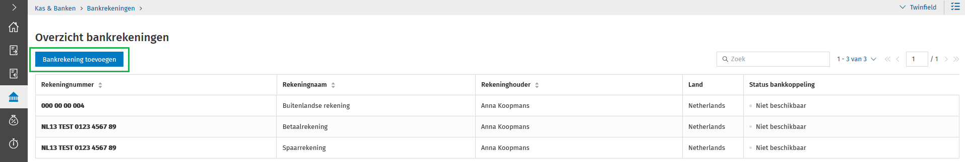 Zodra alle velden geldig zijn, kies dan [Aanmaken]. De bankrekening is zichtbaar in het overzicht.