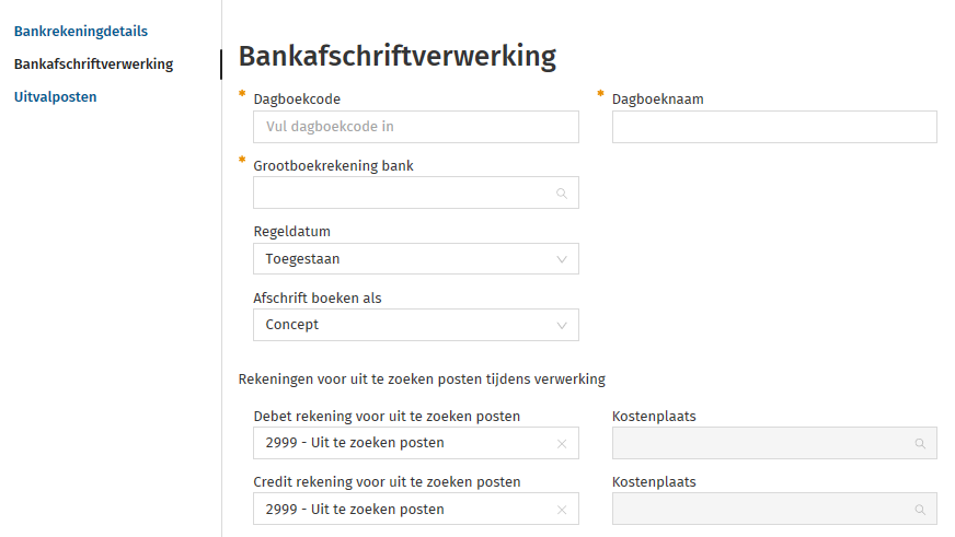- Uit te zoeken posten rekening: vul hier de grootboekrekening in waar de ‘nog uit te zoeken’ afschriftregels op worden geboekt. Meestal worden debet en credit op dezelfde grootboekrekening geboekt, maar dit is niet verplicht. Het is mogelijk een kostenplaats in te stellen, maar dit is niet gebruikelijk. Wil je deze grootboekrekening afletteren? Lees dan ook: Hoe maak ik een tussenrekening afletterbaar?