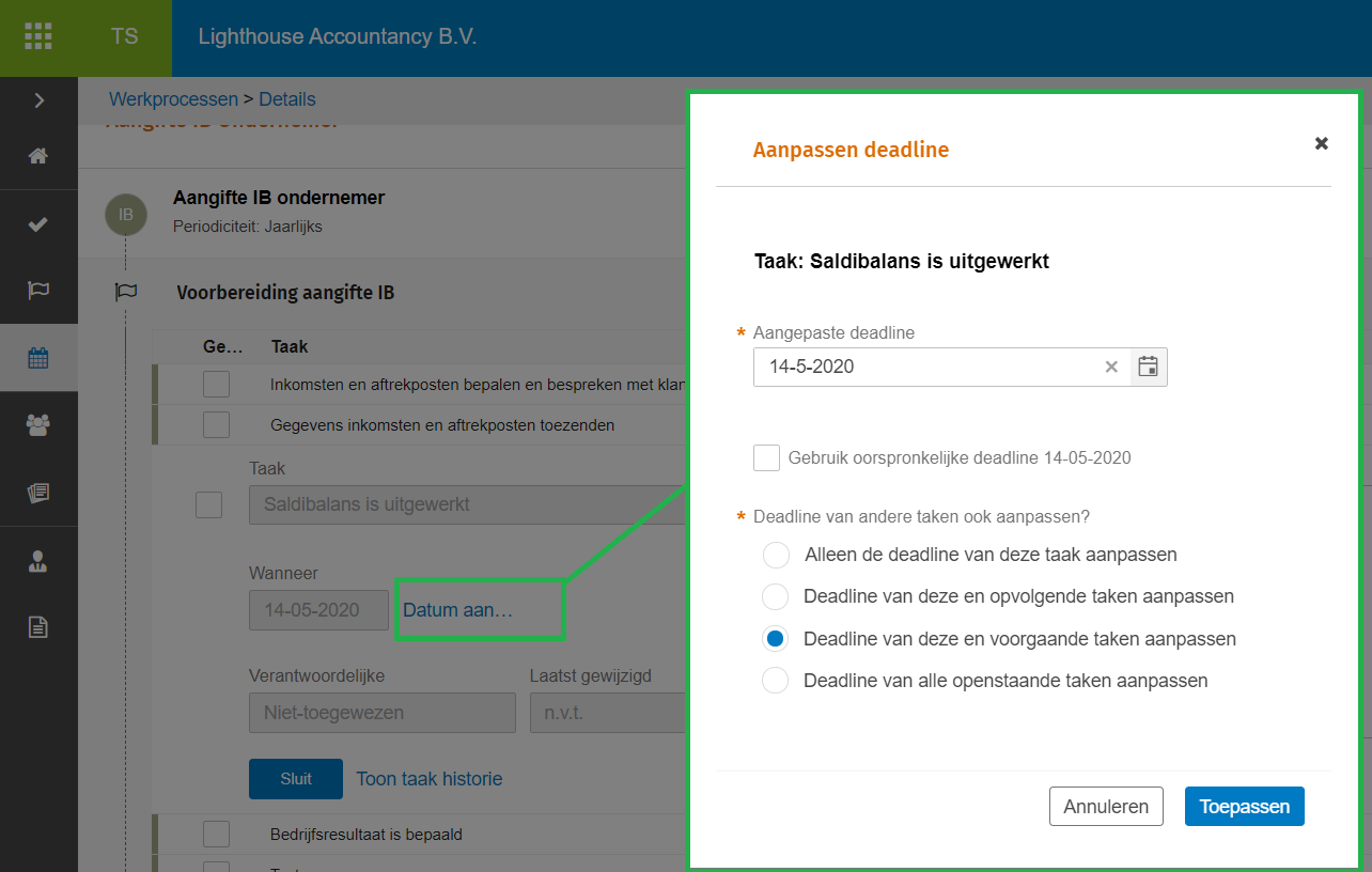 Dat kan eenvoudig vanuit de werkprocessen. Daar is het makkelijk om 'in te lopen' op de taken of juist extra ruimte te creëren door ze naar achteren te schuiven. Als de deadline van een taak wordt aangepast, zijn er de volgende mogelijkheden: