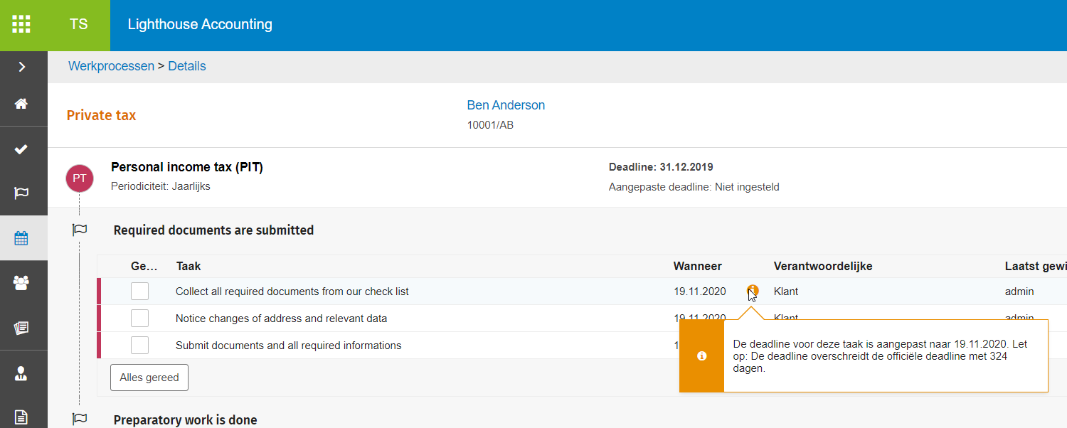 De onderlinge doorlooptijd tussen de taken blijft gehandhaafd. Er is ook een specifieke vermelding als er een officiële deadline wordt overschreden. Je ziet dan het aantal dagen waarmee de deadline wordt overschreden.