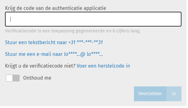 - Activeer eventueel de optie 'Onthoud me' om te voorkomen dat je bij elke aanmelding via dit apparaat (en browser) de MFA dient op te geven. Overigens wordt het wachtwoord met deze optie niet onthouden.