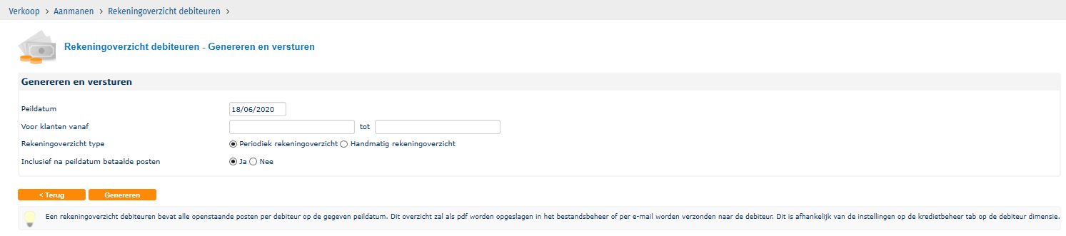 - Handmatig rekeningoverzicht: er wordt een rekeningoverzicht voor alle debiteuren gemaakt die binnen de opgegeven klantreeks vallen, ook wanneer het vorige rekeningoverzicht minder dan 14 dagen terug is gegenereerd.
