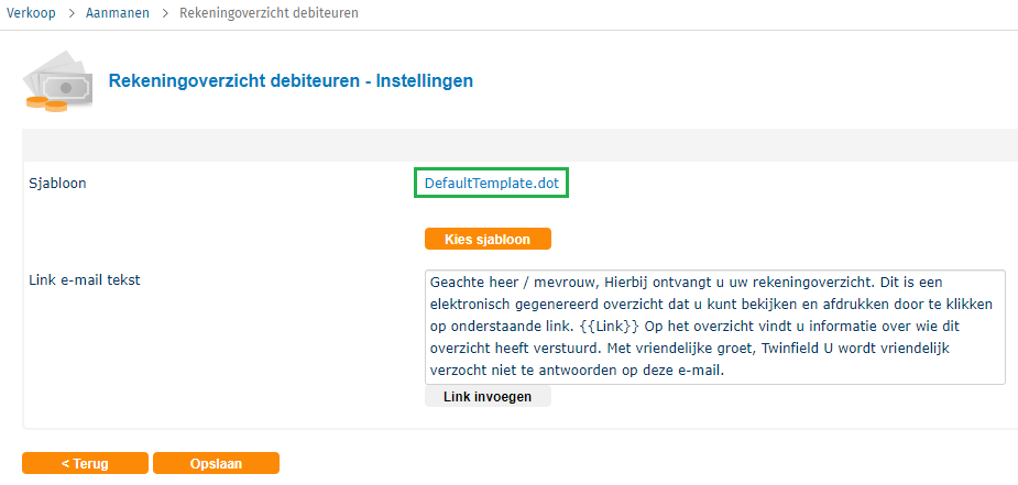 Tevens bestaat er de mogelijkheid tot het maken van een eigen sjabloon. Voor het aanmaken van een eigen sjabloon kan het standaard sjabloon worden gebruikt om mee te beginnen. Door te klikken op “DefaultTemplate.dot” kan het standaard sjabloon worden geopend. Dit sjabloon kan naar eigen inzicht worden aangepast door het gebruik van alle velden die beschikbaar zijn voor het rekeningoverzicht debiteuren. Als het sjabloon eenmaal klaar is voor gebruik moet het worden opgeslagen als een '.dot' of '.doc' bestand. In het sjabloon zijn 'mergevelden', samenvoegvelden, opgenomen die verwijzen naar de velden in Twinfield. Deze velden moeten niet worden aangepast, deze velden kunnen wel verplaatst of verwijderd worden. Rechtsbovenin dit kennisartikel is een bijlage 'uitleg Wordsjablonen' beschikbaar. Dit is een overzicht van alle beschikbare velden en hun functies te vinden.