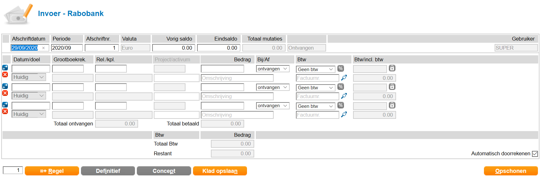- + Regel: kies deze optie om extra boekingsregels toe te voegen, de invoer wordt tevens automatisch klad opgeslagen.