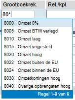 - Voer bijvoorbeeld een aantal letters uit de naam van de grootboekrekening of een deel van het nummer invoeren, eventueel aangevuld met een sterretje om een specifieke grootboekrekening te zoeken. Voorbeeld: wanneer je een rekening zoekt in 80-rubriek, vul je 80* in. Je krijgt dan een overzicht van alle rekeningen die beginnen met 80. Het is ook mogelijk een overzicht van alle grootboekrekeningen te krijgen door in dit veld te dubbelklikken. Met page-up en page-down kan je door de voorgestelde grootboekrekeningen bladeren.