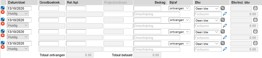 - Bij/af: geef aan of om een ontvangen of een betaald bedrag gaat.