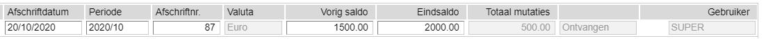 - Afschriftnr.: dit veld bevat het afschriftnummer, het volgnummer van de bankboeking. Zie eventueel: Hoe wordt de afschriftnummering voor de bankafschriften bepaald?