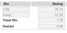 - Btw: Dit overzicht geeft de totalen van de boeking voor elke btw percentage weer. Dit overzicht is puur informatief en wordt berekend door het systeem. Het komt voor dat de btw berekening door het systeem als gevolg van afrondingsverschillen niet overeenstemt met de btw berekening op de boekstukken. In het veld "Restant" blijft dan na het invoeren van de boekingsregels een verschil van één of enkele centen staan. Dit verschil kan vereffend worden door op de button Vereffenen te klikken. Wanneer het btw bedrag op de factuur meer dan 0.02 afwijkt van het bedrag dat het systeem heeft berekend, klik dan op het "slot" achter het btw-bedrag om het btw bedrag te corrigeren.