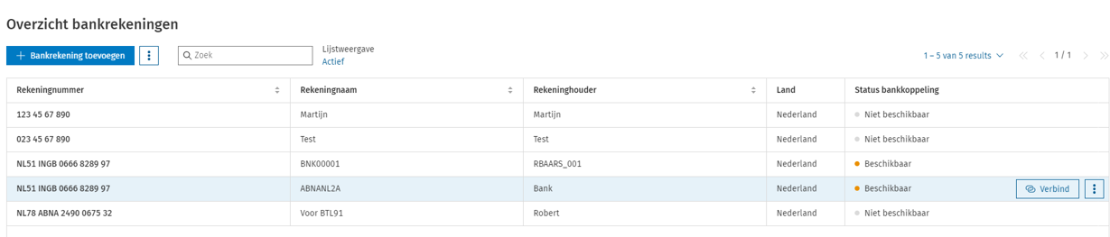 - Beschikbaar: kies 'Verbind' om de rekening te verbinden om een bankkoppeling tot stand te brengen.