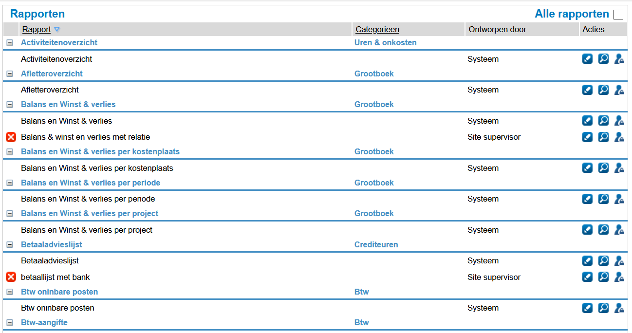 Het rapportenbeheer biedt een overzicht van alle rapporten in de omgeving: de standaard  rapporten plus de toegevoegde, aangepaste, rapporten. De aangepaste rapporten zijn te herkennen aan het rode kruis aan het begin van de regel en doordat het is ontworpen door een gebruiker.