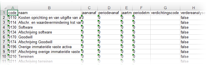 - Kolom L - Btwcodevast: Geef met de waarde 'true' eventueel aan dat enkel de gekoppelde btw-code (kolom K) in het vervolg bruikbaar is voor mutaties op deze grootboekrekening. Zoniet, kies dan de  waarde 'false'.