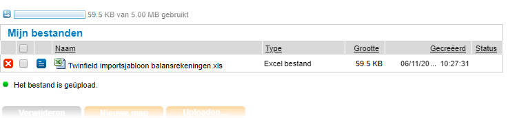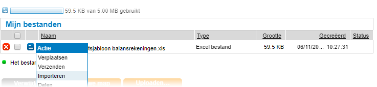 - Het geüploade importsjabloon is toegevoegd aan Bestandsbeheer maar het bestand is nog niet geïmporteerd in de administratie.