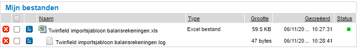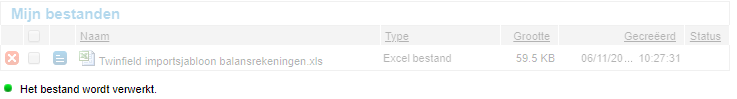 Is de import afgerond, dan toont de regel van het geïmporteerde bestand het resultaat van de import in de vorm van een symbool. De kolom 'Status' toont of de import (volledig) succesvol is afgerond: