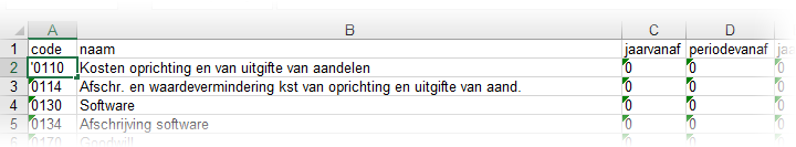 Standaard herkent Excel een ingevoerde code als numerieke waarde en haalt vervolgens een eventuele voorloopnul van een grootboekrekeningnummer weg ('0216' = '216'). Voer in de cel voorafgaand aan het nummer een apostrof in om dit te voorkomen. Eventueel is het ook mogelijk om het formaat van deze cellen via de cel-eigenschappen te veranderen naar 'Tekst'.