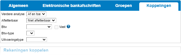 - Indien er sprake is van een subadministratie, zoals bij de grootboekrekening 'Debiteuren', dan dient deze grootboekrekening als 'Niet afletterbaar' te worden ingesteld. Voor deze grootboekrekening is de optie 'Verdere analyse' actief waardoor de aflettering niet op de grootboekrekening maar op de relatie uit de subadministratie (debiteur) plaatsvindt.
