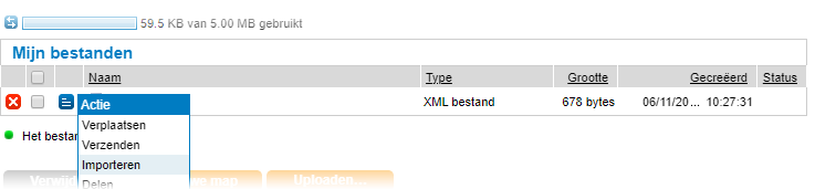 - Klik vervolgens op het menu (icoontje) op de regel van het bestand om de actie 'Importeren' te selecteren.