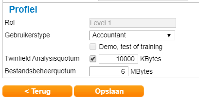 In het tabblad Algemeen van de betreffende gebruiker, onder Profiel, staat het Twinfield Analysisquotum. Stel een waarde in kB in, 1024 KB = 1MB.