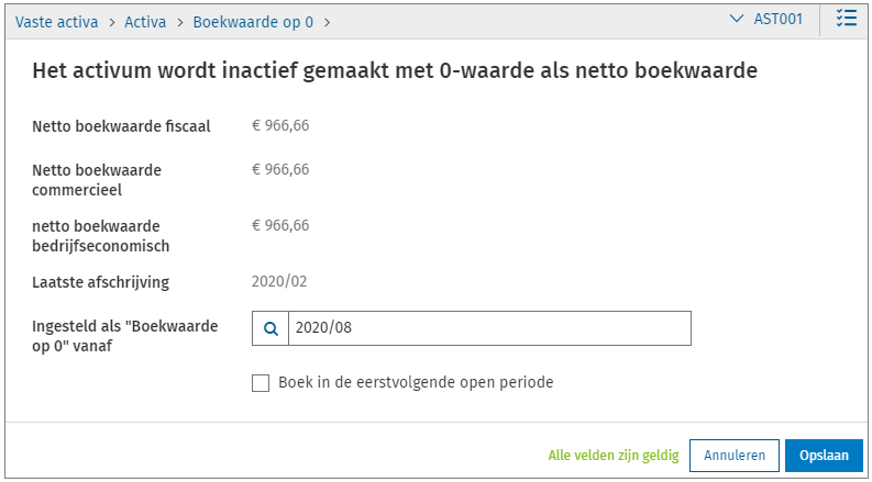 Het tabblad ActiefBoekwaarde op 0In dit voorbeeld gaan we via de knop [Boekwaarde op 0] de boekwaarde van het onderstaande activum op 0 zetten in de periode 2020/08.