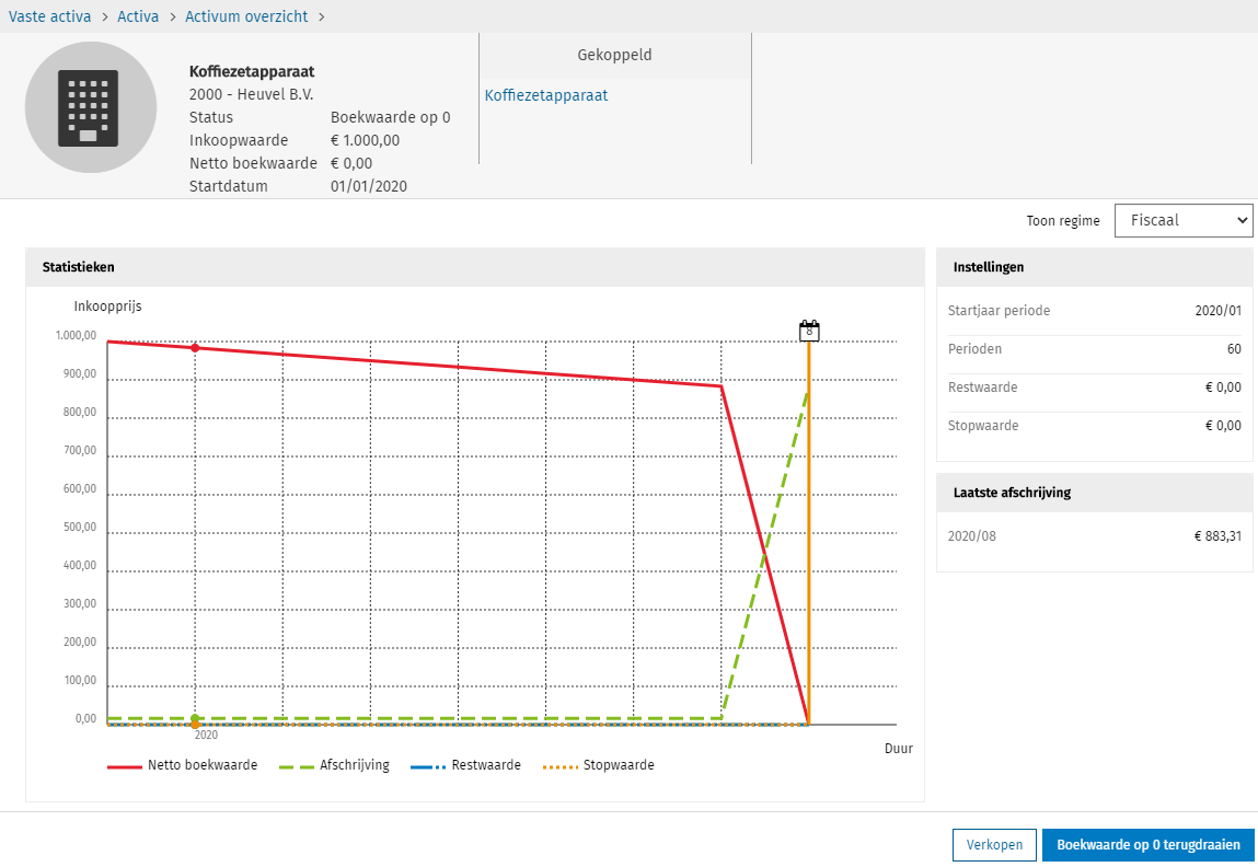 Let op: De standaard afschrijvingen die tussen de laatst afgeschreven periode en de gekozen periode (2020/03 t/m 2020/07 in dit voorbeeld) zullen niet ongedaan gemaakt worden wanneer je de boekwaarde op 0 terugdraait. Indien gewenst kun je deze periodes na het terugdraaien handmatig ongedaan maken via de knop [Afschrijving ongedaan maken].