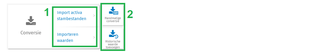 Een nieuw activum aanmakenEen activaconversie kan voor één activum tegelijk worden uitgevoerd via een handmatige conversie, maar ook voor honderden tegelijk via een Excel-import. Hieronder wordt uitgelegd hoe je een handmatige conversie kunt uitvoeren. Via een Excel-import voer je dezelfde stappen uit, maar dan in bulk. Gebruik de knoppen bij nummer 1 in de schermafdruk hieronder om in bulk te converteren. Gebruik de knoppen bij nummer 2 om één activum tegelijk te converteren.