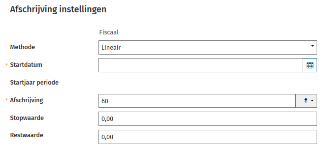 | Methode | Ja | Geef de afschrijvingsmethode op waarmee het afschrijvingsbedrag moet worden berekend. In dit artikel lees je meer over de afschrijvingsmethodes: Welke afschrijvingsmethodes zijn er? |
