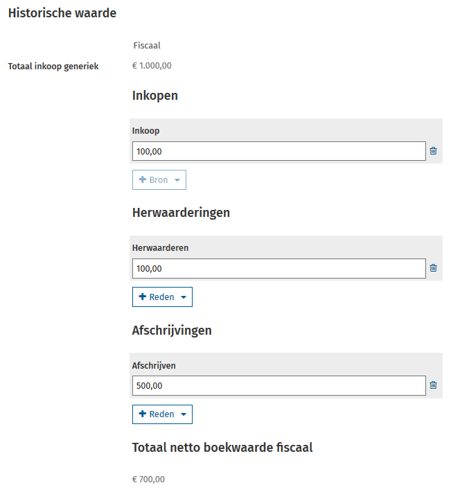 | Inkopen | Nee | Klik op de knop [+ Bron] om indien gewenst fiscale inkoopwaarde toe te voegen aan het activum. Twijfel je of je inkoopwaarde generiek of fiscaal moet toevoegen? Lees dan eerst dit artikel: Welke regimes zijn er? |