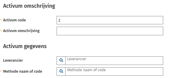 | Methode naam of code | Ja | Vul hier de methode in die je wilt gebruiken voor het activum. In dit artikel lees je meer over methodes: Methodes vastleggen |