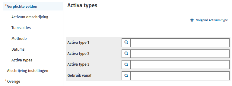 | Gebruik vanaf | Geef aan per wanneer je de types wilt gebruiken. Bij de afschrijvingsinstellingen (Een nieuw activum aanmaken (afschrijvingsinstellingen)) geef je een startdatum op voor het afschrijven. Het jaar dat je opgeeft moet gelijk zijn aan het startjaar voor afschrijven. Indien gewenst kun je per jaar andere types gebruiken. Door op de link Volgend Activum type te klikken, kun je voor andere jaren andere types vastleggen. De eerste activatypes blijven altijd geldig totdat je nieuwe activatypes opgeeft, en zo verder. |